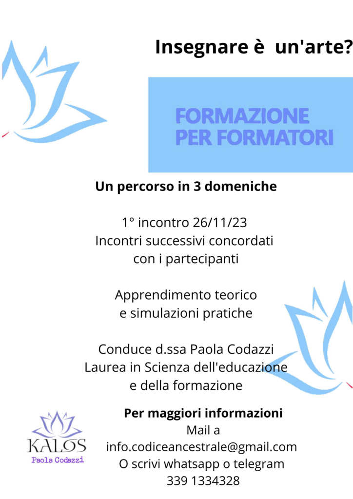 Al fine di preparare i formatori a creare i loro corsi in modo funzionale, con i migliori supporti didattici e con le corrette modalità di comunicazione, propongo incontri di Formazione per Formatori. I percorsi si possono svolgere nella mia zona, in Provincia di Verbania, o su richiesta in altre sedi o online, sia con lezioni di gruppo che individuali. Se ti interessa questo argomento e non trovi un evento pianificato in questo periodo, contattami, che cerchiamo di comprendere cosa posso proporti in modo personalizzato in base alle tue esigenze.